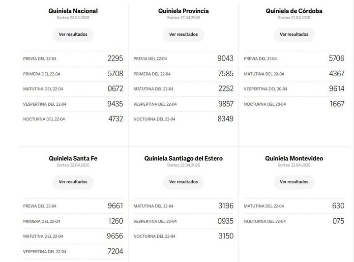 Sin categoría Quinielas: Nacional, Provincia, Córdoba, Santa Fe, Santiago del Estero y Montevideo del 22 de Abril 23 abril, 2026 148 Tags: Nacional, REGIONAL Más historias Sin categoría Gimnasia y Esgrima de La Plata goleó a Acassuso y pasó a los octavos de final de la Copa Argentina 23 abril, 2026 160 Sin categoría Feriados del próximo mes de mayo que generarán fines de semana largo 23 abril, 2026 93 Sin categoría Lo dicen otros medios: cinco estaciones de peaje tendrá la Ruta 5 en el denominado Tramo Pampa 23 abril, 2026 172 Sin categoría Lo dicen otros medios: Kicillof puso en marcha el plan director de caminos rurales y firmó los primeros convenios con ocho municipios 23 abril, 2026 188 Sin categoría Lo dicen otros medios: Katopodis recorrió obras en Bragado y confirmó avances para el Polideportivo 23 abril, 2026 130 Sin categoría Quini 6, vacante en las modalidades Tradicional, La Segunda y Revancha 23 abril, 2026 168
