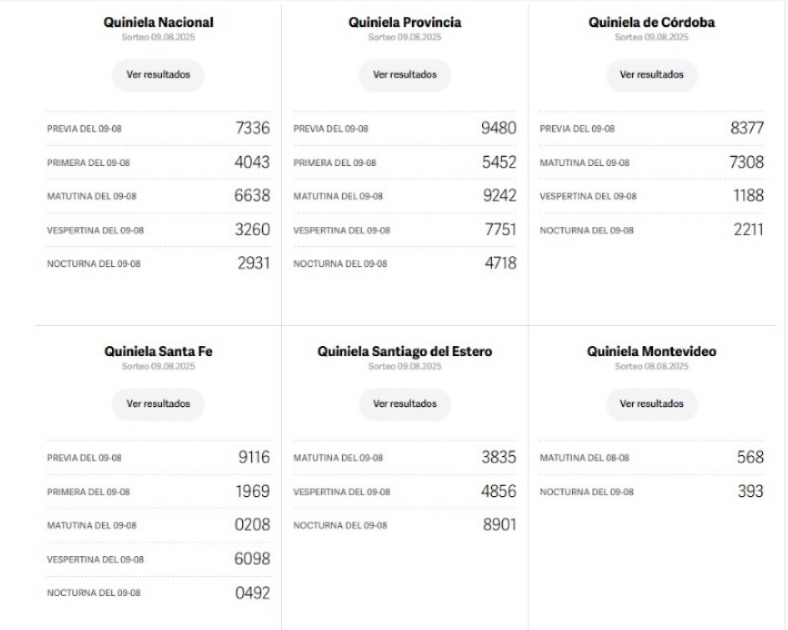 Quinielas: Nacional, Provincia, Córdoba, Santa Fe, Santiago del Estero y Montevideo