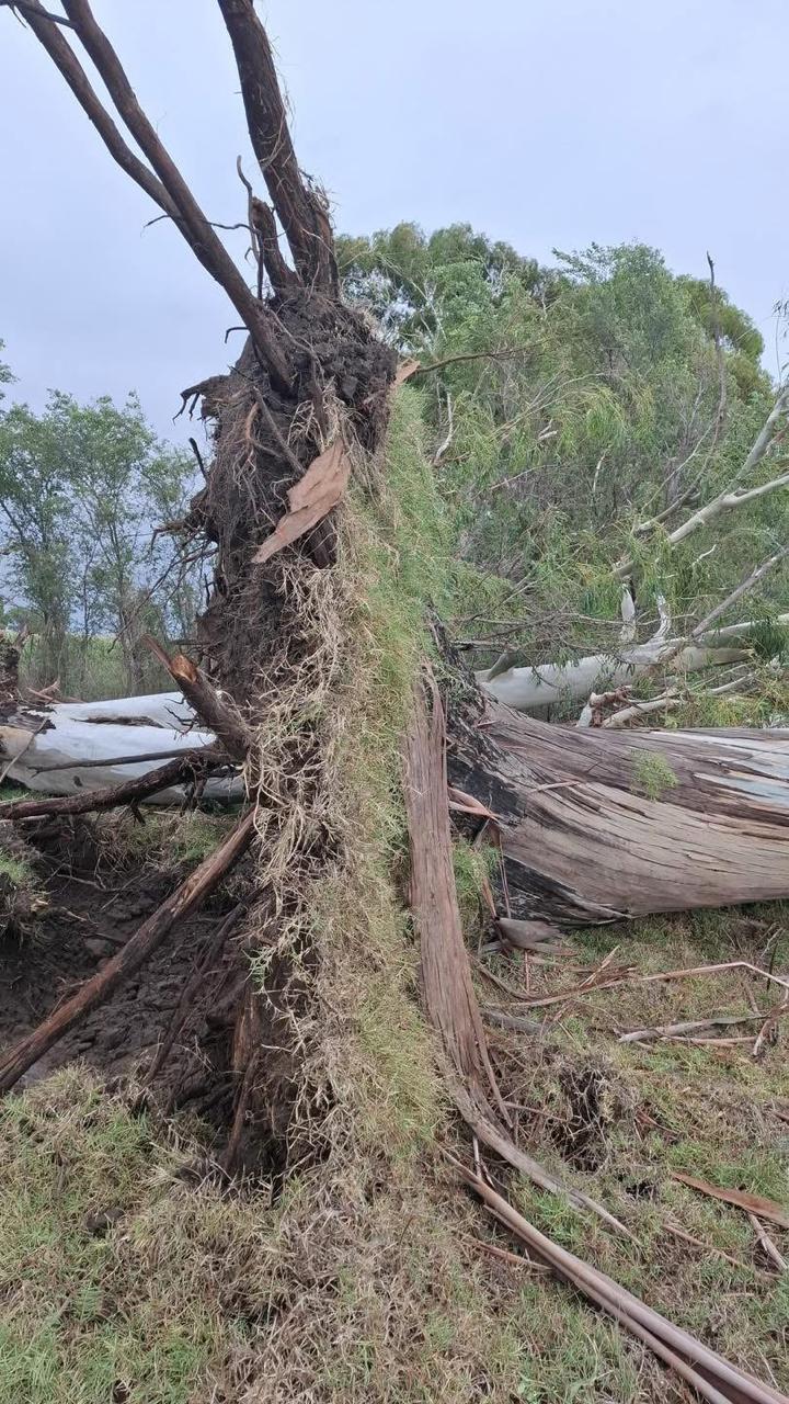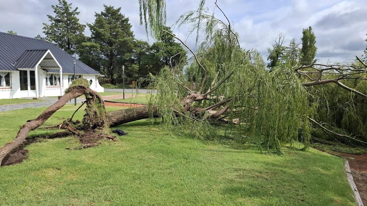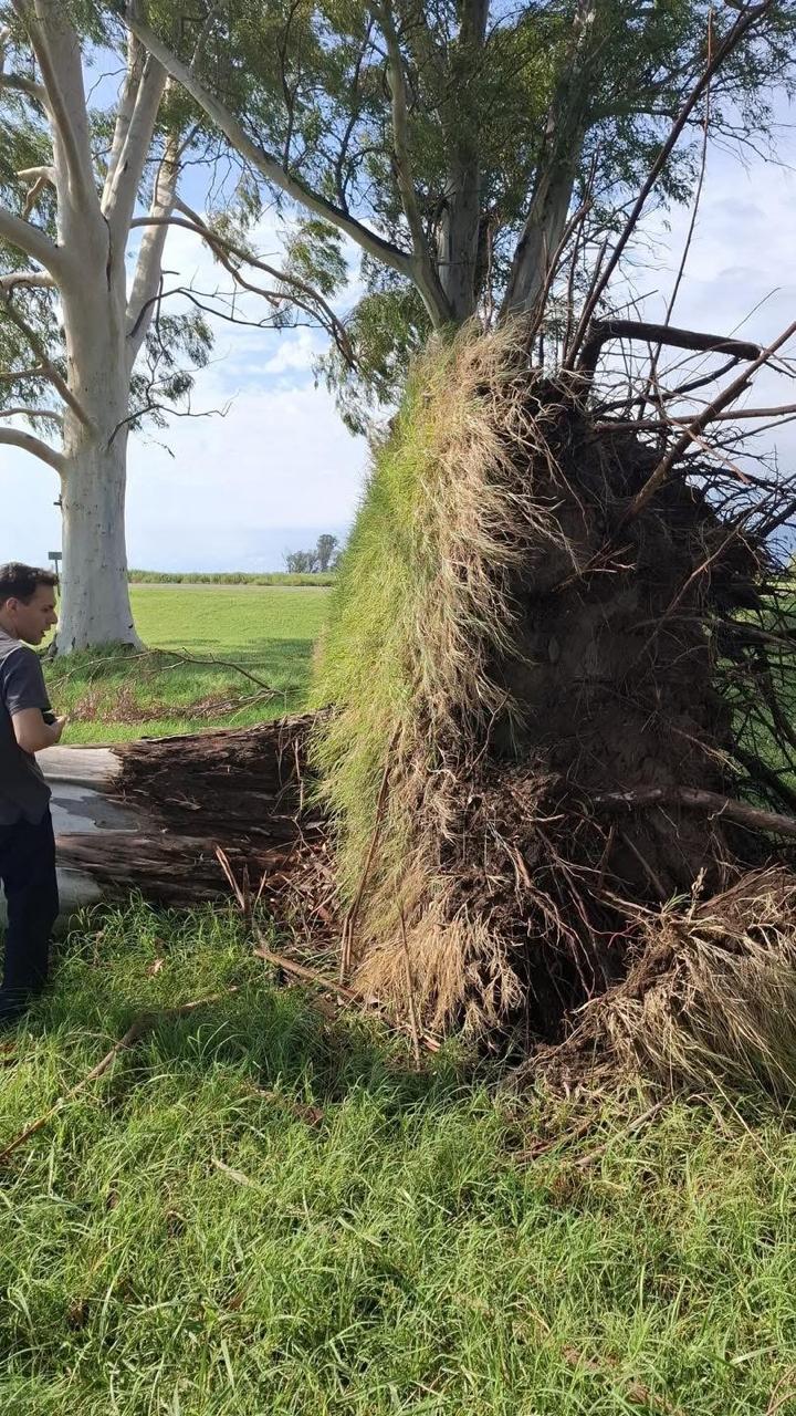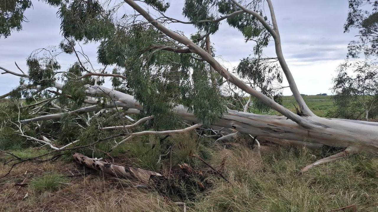 Constató un total de 16 árboles caídos (de raíz), de tipo Eucaliptus, Pinos, y Sauce. Ramas y gajos en distintos lugares y postes de luz afectados.