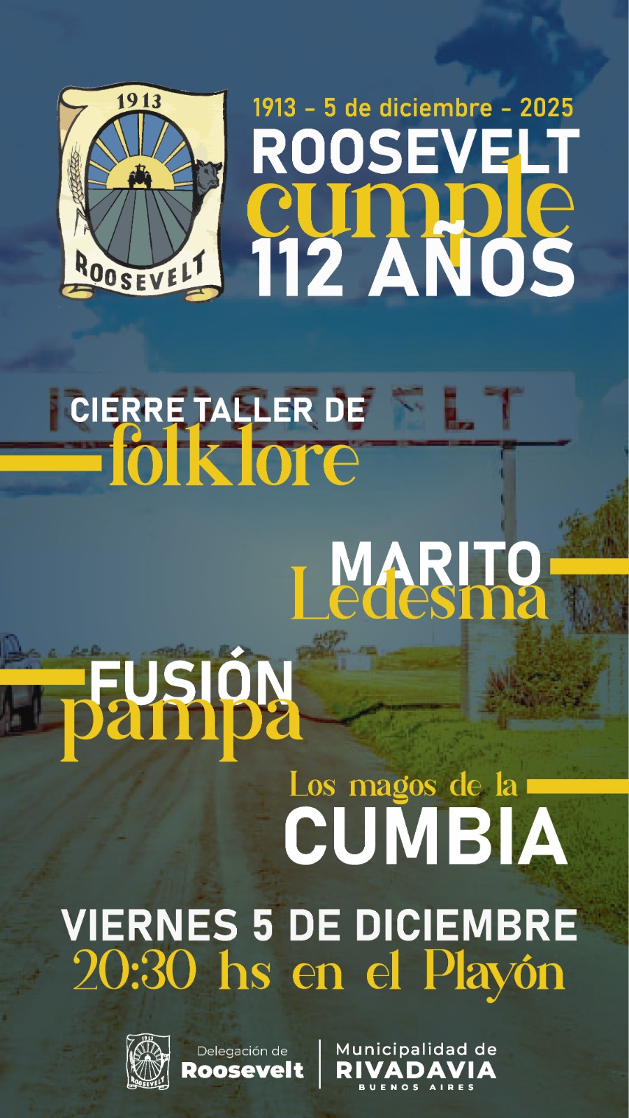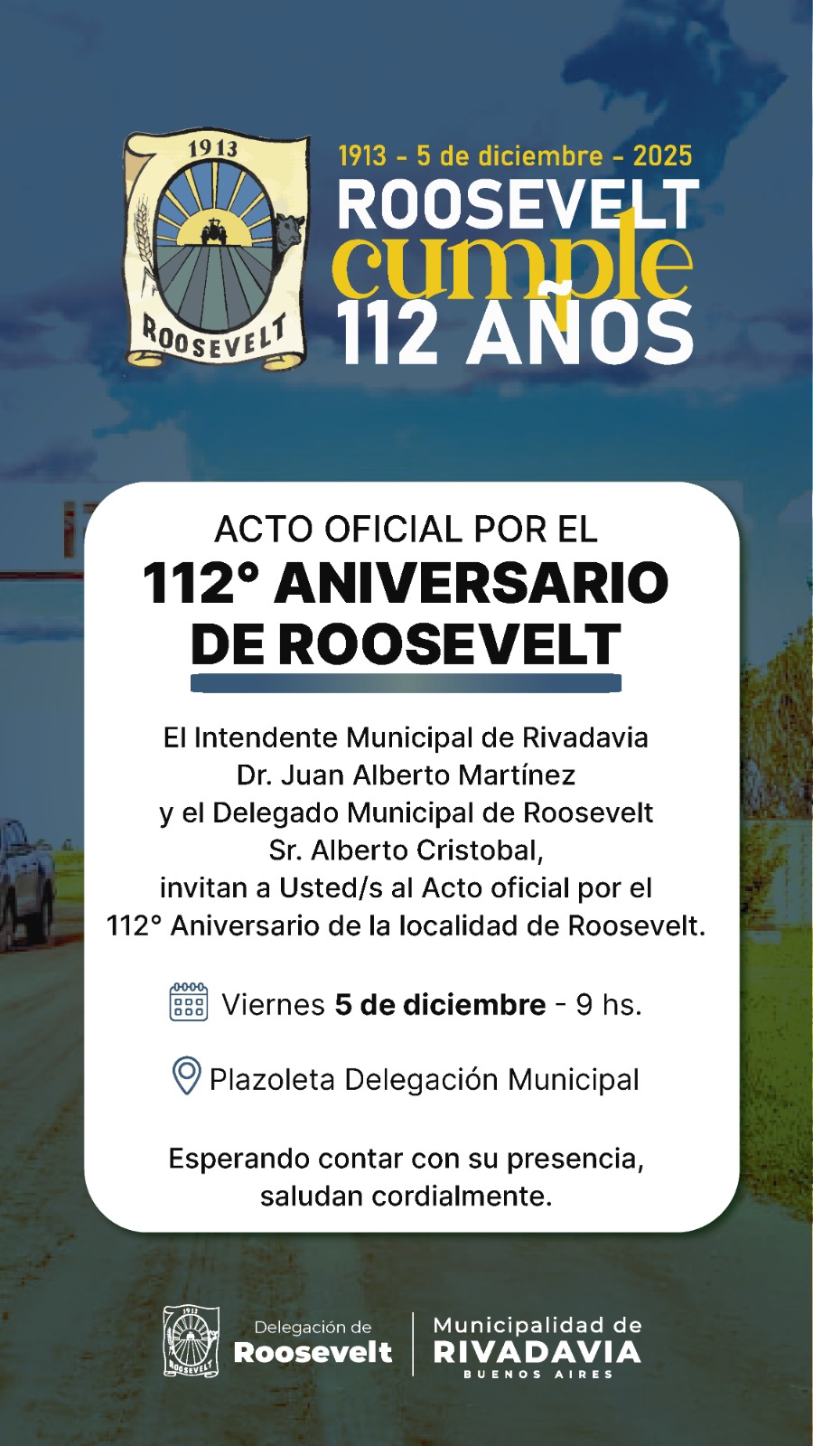 Se realizará hoy viernes, a las 9 horas, el acto oficial por el 112 aniversario de la localidad de Roosevelt, en el distrito de Rivadavia.