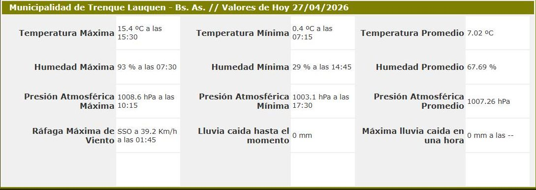 En #TrenqueLauquen, siempre se debe considerar que la Estación Meteorológica Digital propiedad del Municipio Trenque Lauquen está instalada en el Club de Planeadores a 6.6 km de la Plaza Principal, la temperatura mínima de ayer fue de 0.4° a las 7.15 y que la máxima no alcanzó a los 16°.