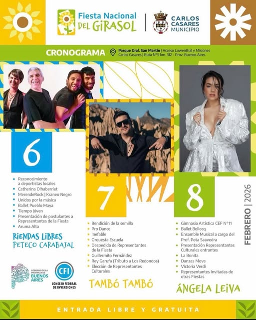 Las actividades concluirán el domingo 8, cuando la XXX Representante Cultural Nacional, Irina Bonetti, presentará su proyecto cultural titulado “Proyecto GirasolArt” sobre el escenario principal, acompañada por la Escuela de Danzas MOVE. Asimismo, durante esta jornada se recibirá a delegaciones invitadas de distintas fiestas nacionales y provinciales del país, promoviendo el intercambio cultural y fortaleciendo el carácter federal que distingue a este evento.