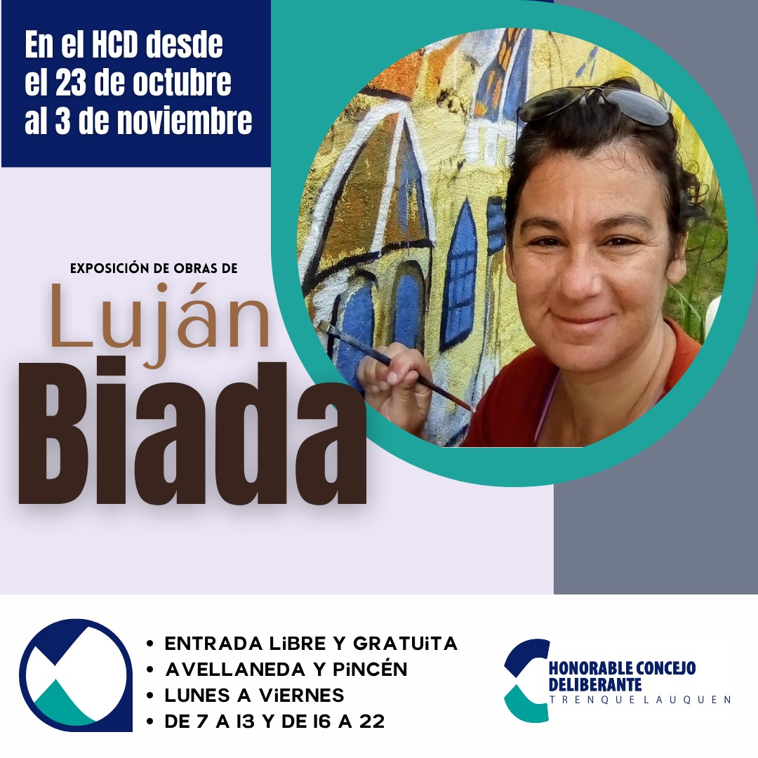 En esta oportunidad las pinturas pertenecen a Luján Biada, que es profesora de artes visuales y cuenta con una dilatada trayectoria en la docencia en diferentes escuelas públicas. También ha participado en varias muestras grupales, pero ésta será la primera vez que lo hará como única protagonista y sólo con obras de su autoría.
