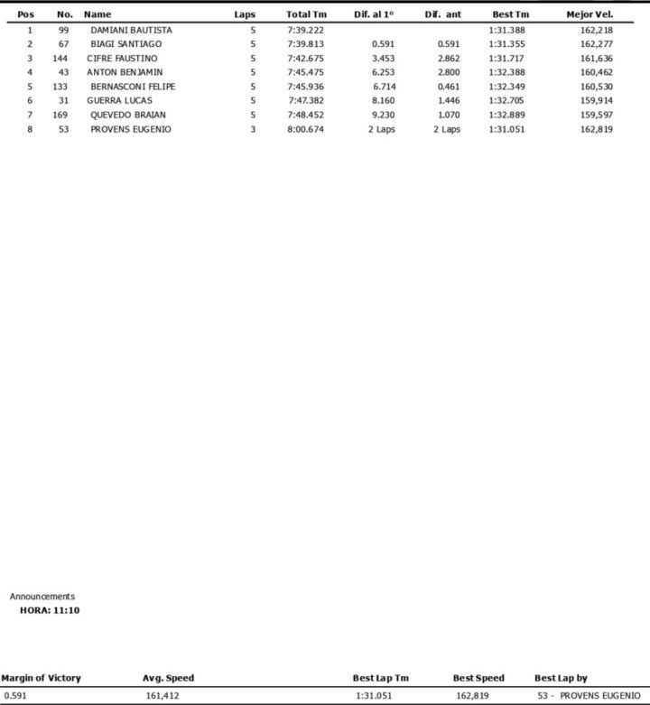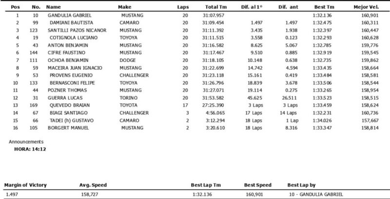 El piloto del Moriatis Competición largó desde la “pole position” y fue inalcanzable para Damiani, quien con los 25 kilos de lastre que carga debido a su éxito en la apertura del certamen no pudo plantearle pelea de igual a igual. Gandulia, que había luchado por la victoria en El Calafate precisamente con el piloto del Canning Motorsports, logró su 3º triunfo en 62 carreras en el TC Pista (también había ganado en El Calafate 2023 y Posadas 2025).