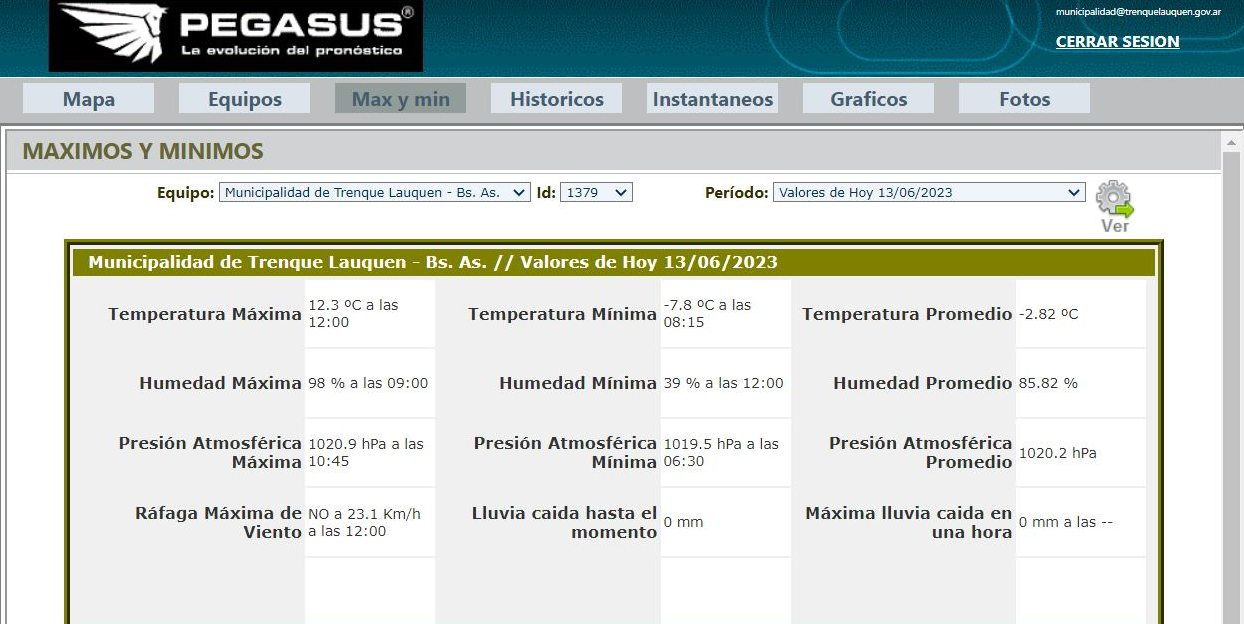 La temperatura mínima de este martes 13 de Junio de 2023 se registró a las 8.15, alcanzando -7.8. Al momento de subir esta información, la marca indicaba 12°3. Seguirán los días de frío, apareciendo en el pronóstico alguna probabilidad de lluvias para el domingo.