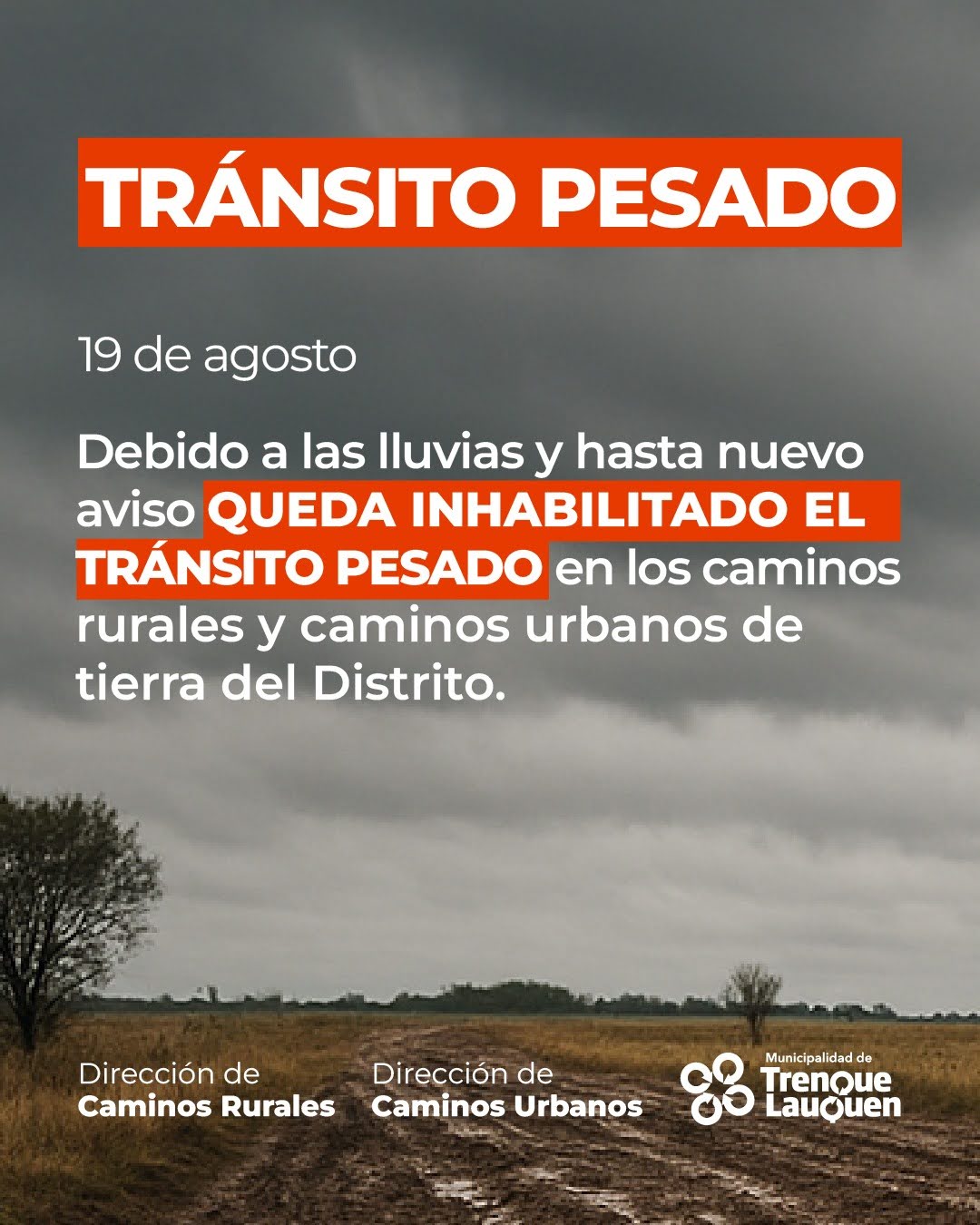 Debido a las lluvias y hasta nuevo aviso está prohibido al Tránsito Pesado los caminos rurales y los caminos de tierra urbanos de todo el distrito de Trenque Lauquen (comprendiendo la medida los XVI cuarteles), informaron las direcciones de Caminos Rurales y de Conservación de Caminos Urbanos del Municipio.