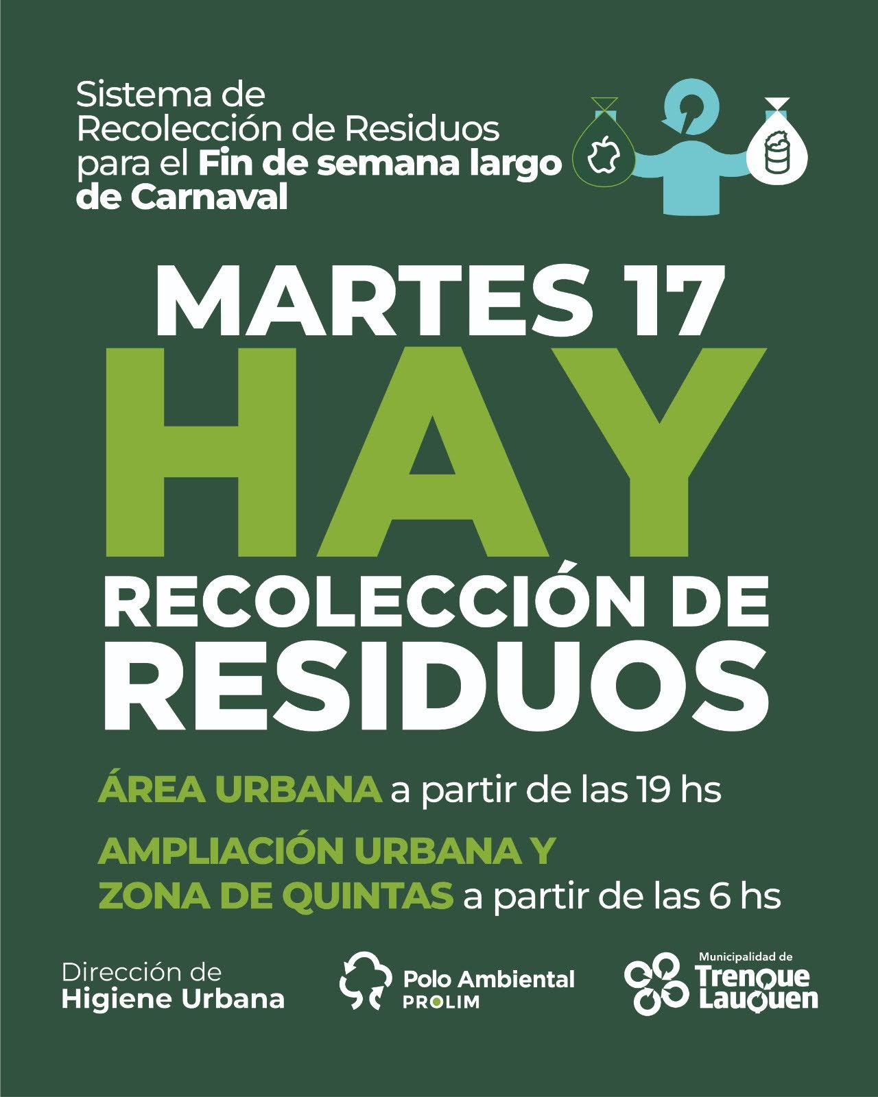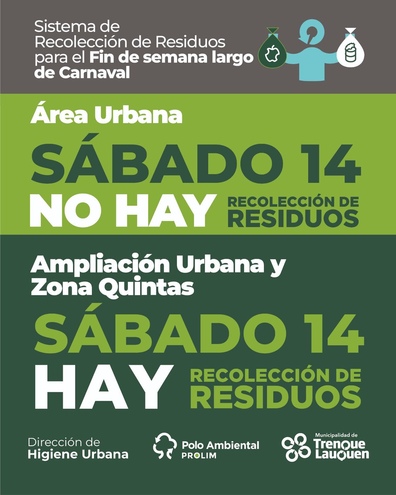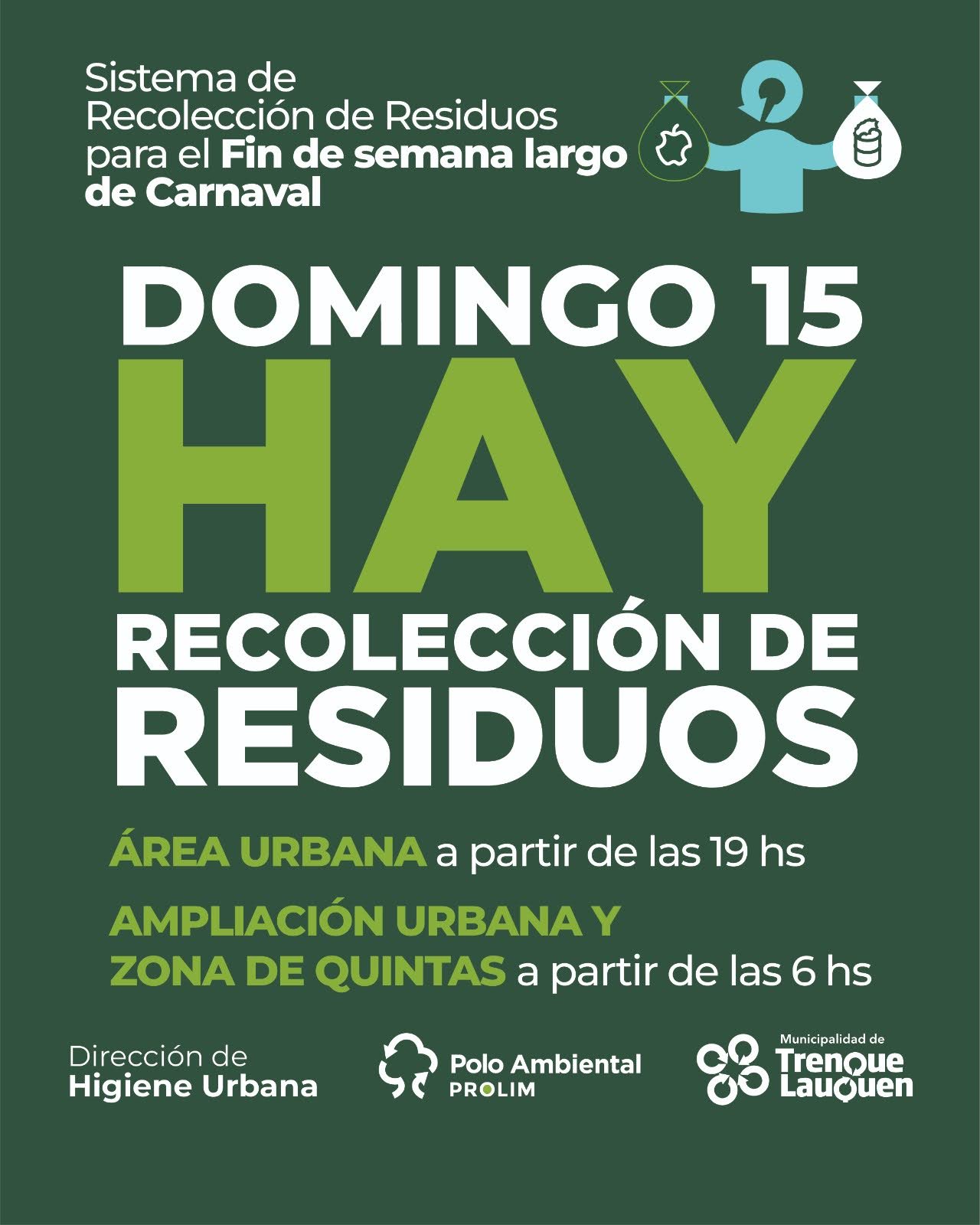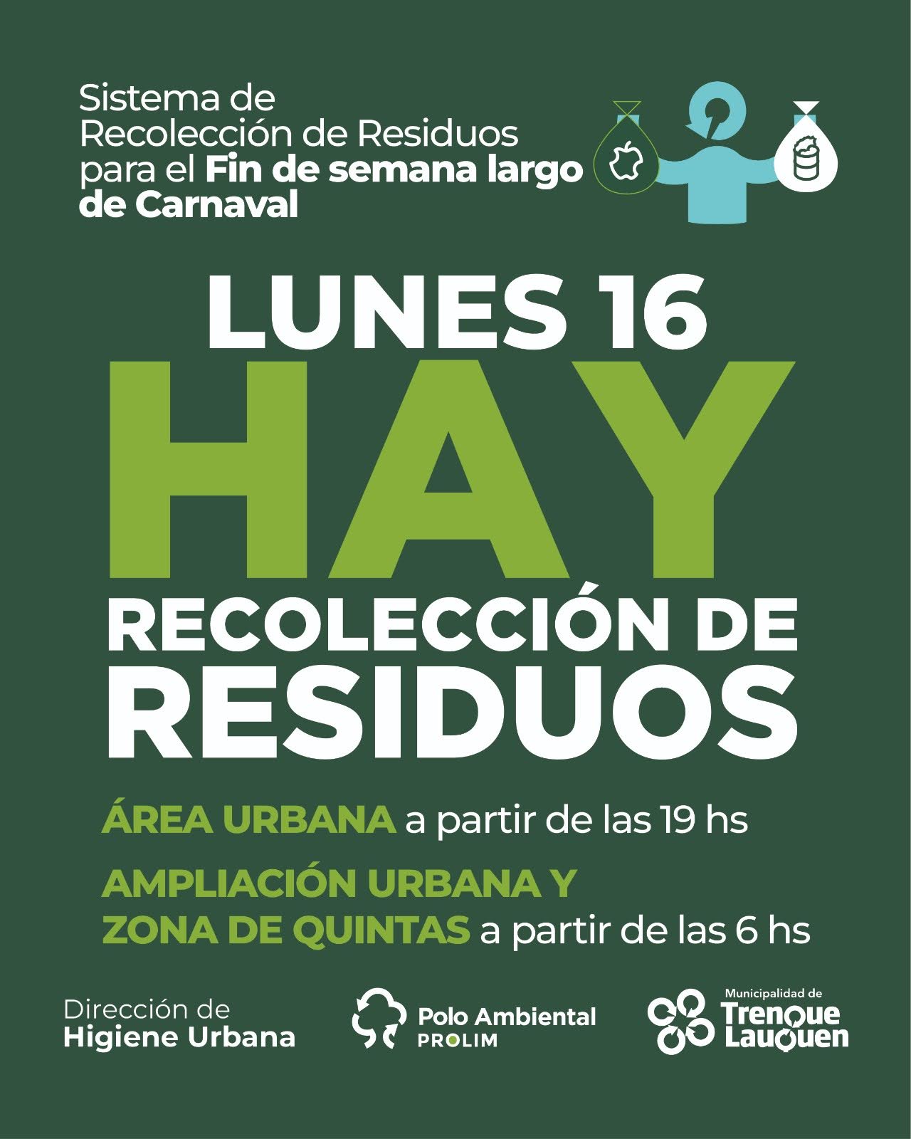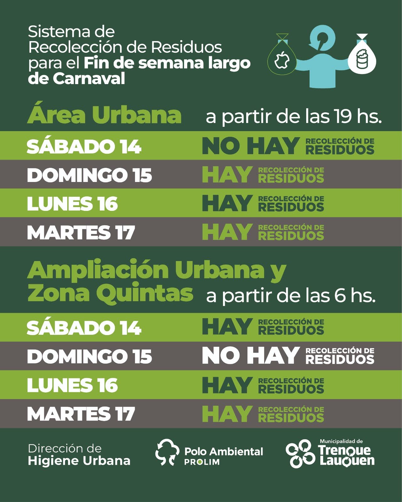 La Dirección de Higiene Urbana de la Municipalidad de Trenque Lauquen informó que este fin de semana largo por el feriado de Carnaval, que incluye los días lunes 16 y martes 17 de febrero, el servicio de recolección de residuos se prestará de manera normal, sin alterar el esquema habitual.