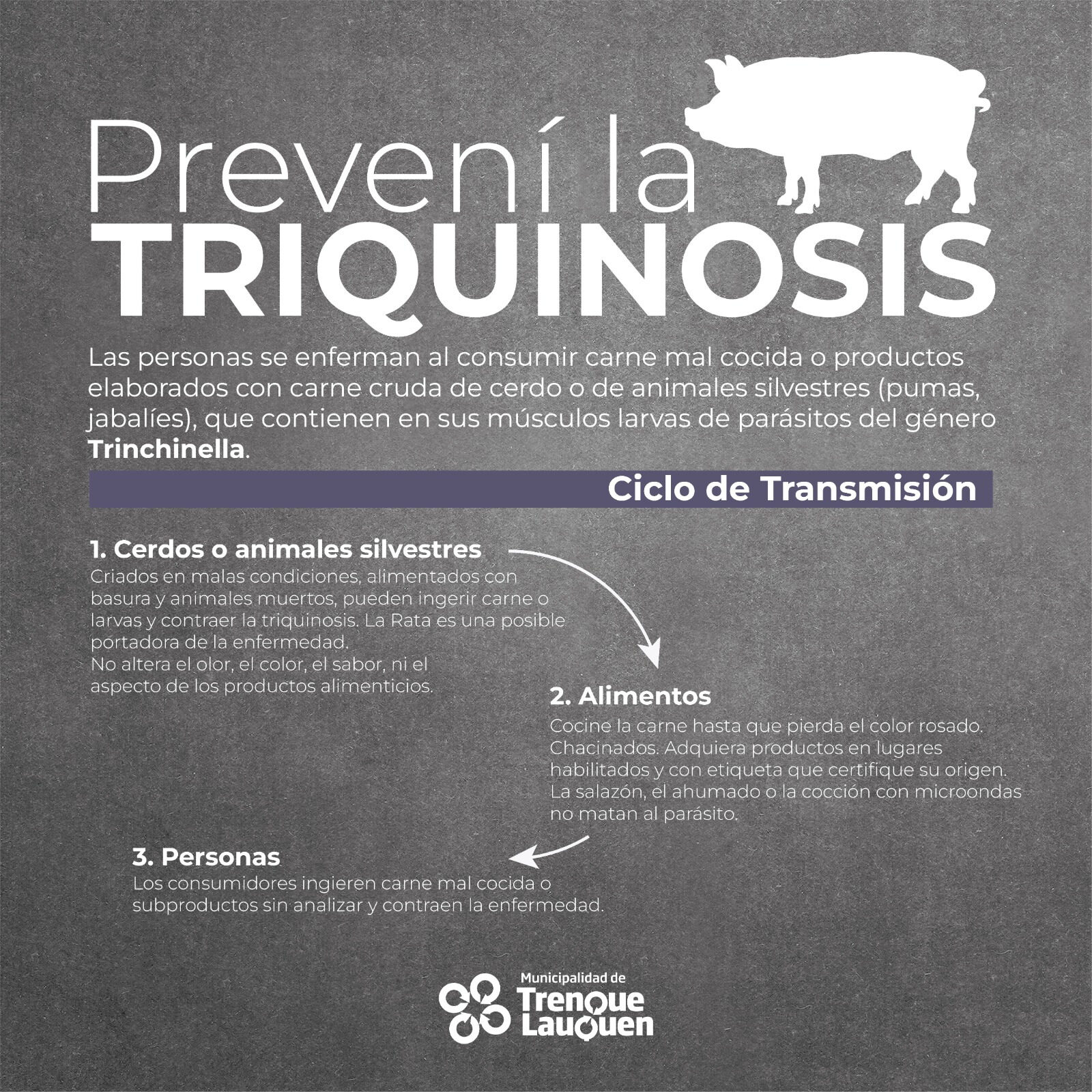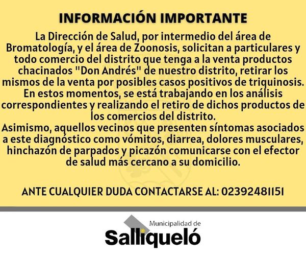 Las áreas de Bromatología y de Zoonosis de la municipalidad de Trenque Lauquen informan que se ha detectado un brote de triquinosis en chacinados provenientes del distrito de Salliqueló y que pudieron ser distribuidos en la región.