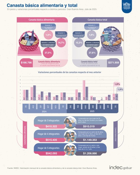 Un hogar de cuatro integrantes necesitó $1.149.352,91 para superar el umbral de pobreza en julio de 2025: 1,9% más que el mes previo y 27,6% interanual