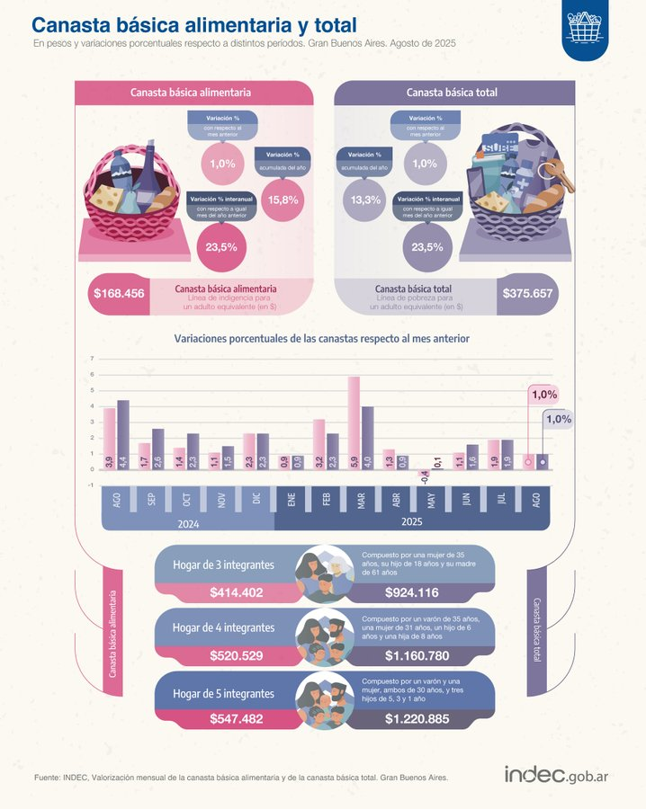 Un hogar de cuatro integrantes necesitó $1.160.780,04 para superar el umbral de pobreza en agosto de 2025