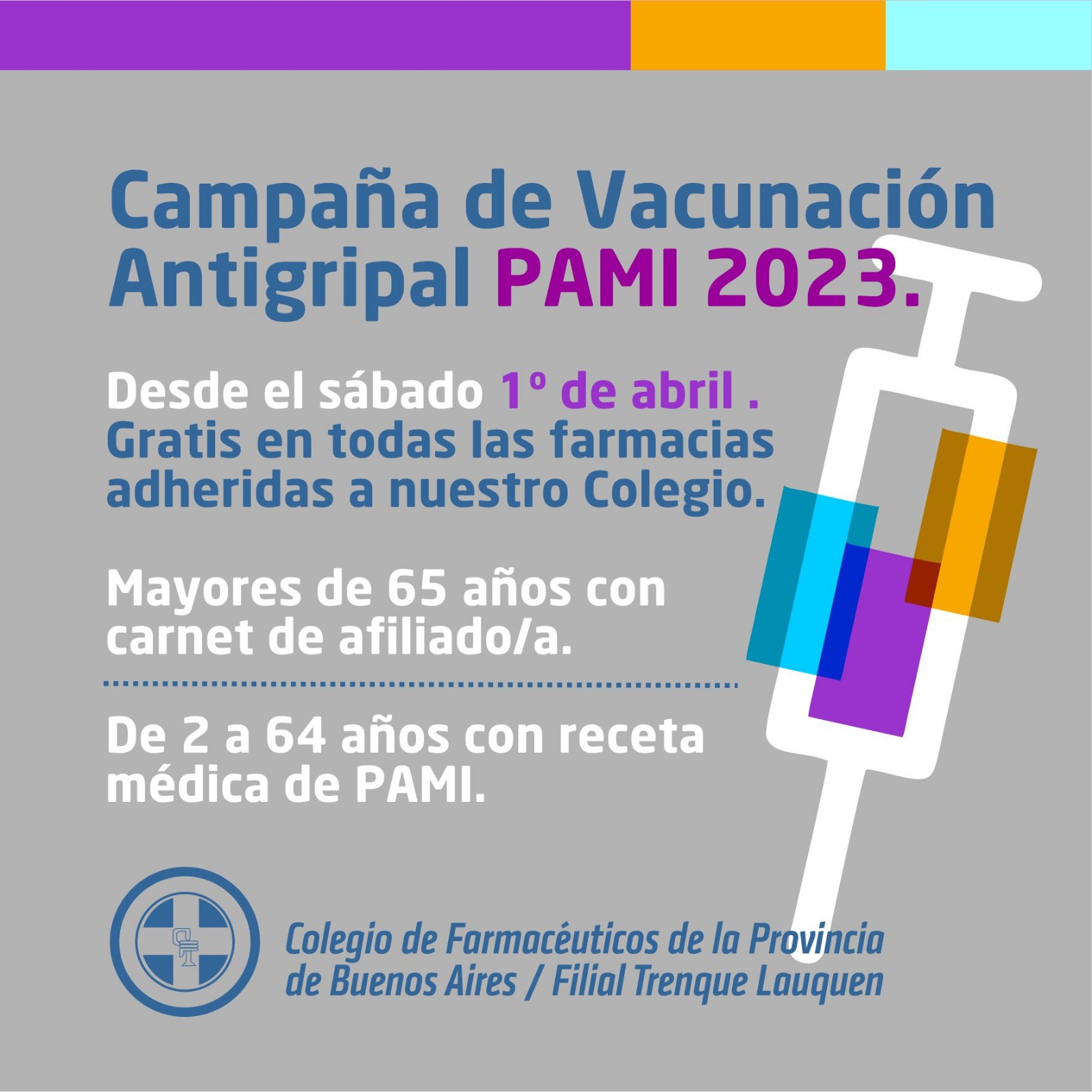 En todas las farmacias adheridas al Colegio de Farmacéuticos de Trenque Lauquen se está aplicando en forma gratuita la vacuna correspondiente a la XXXI Campaña Antigripal y Antineumocócica 2023, a los afiliados al Instituto Nacional de Servicios Sociales para Jubilados y Pensionados (PAMI).